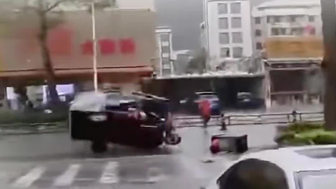 直击强台风“麦德姆”!路上行进的电动三轮车被瞬间吹倒