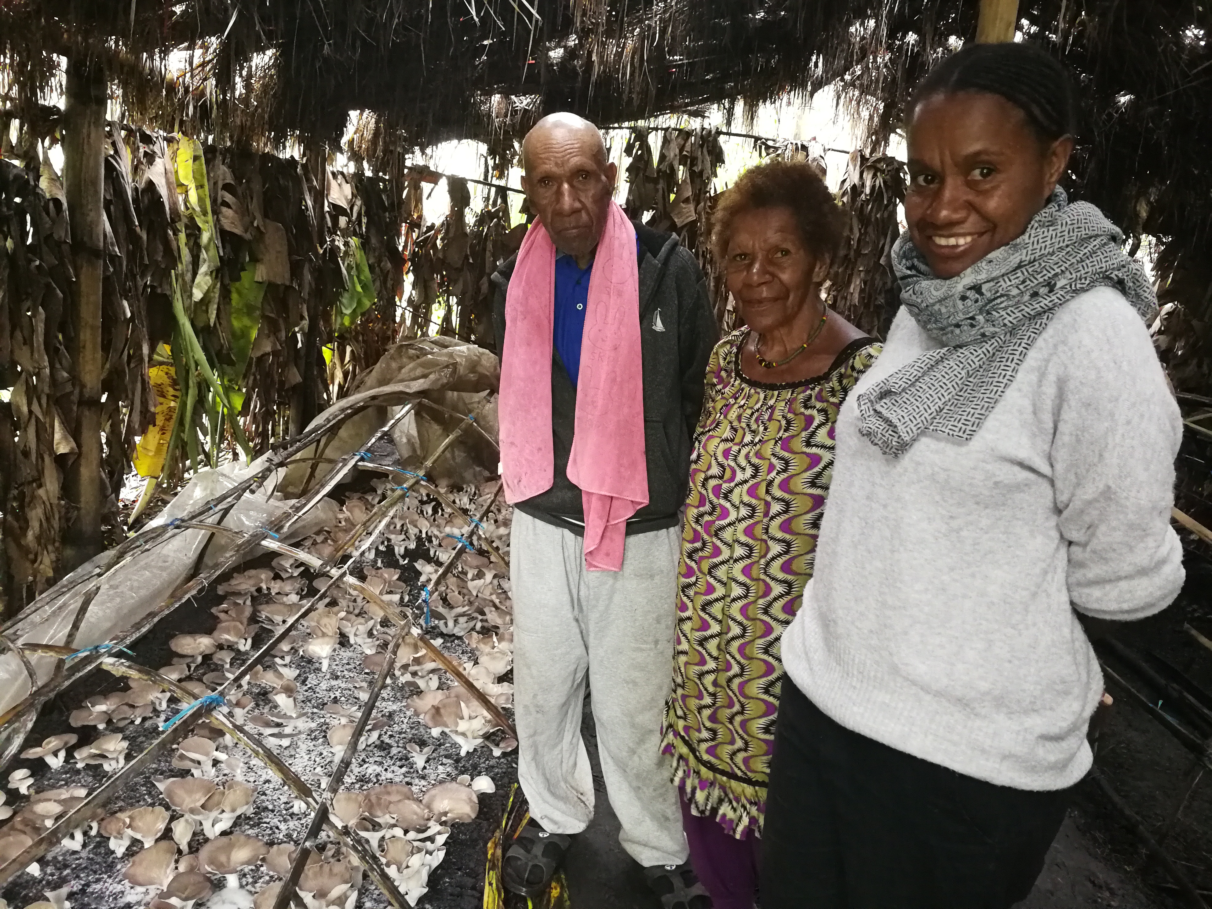 2019年9月9日,在巴布亚新几内亚东高地省鲁法地区,科皮·马诺韦(左1)和女儿普里西利娅(右1)在家中的菌草菇棚里合影。